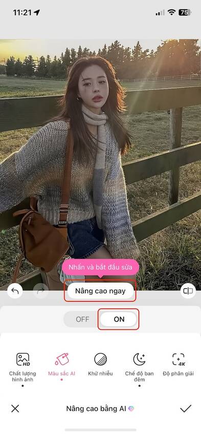 Bước 3: Chọn tiếp tính năng “Màu sắc AI”, sau đó bật “ON” rồi chọn “Nâng cao ngay”. Thuật toán AI tăng cường hình ảnh độc quyền của BeautyPlus sẽ tự động xử lý màu sắc của bức ảnh để cho ra ảnh chất lượng nhất, không còn bị ngược sáng nữa.
