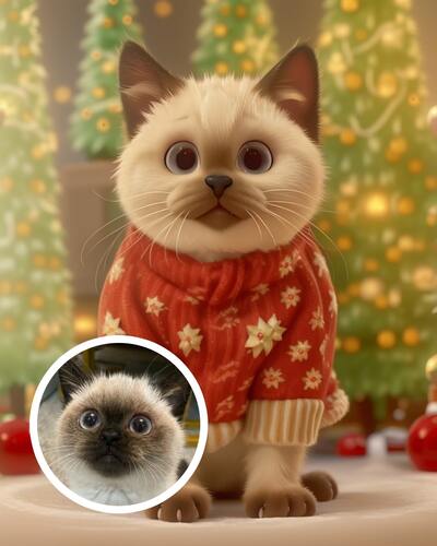 이 크리스마스 펫 스타일은 따뜻함과 아늑함이 가득합니다. 주인공 고양이는 크리스마스 무늬 스웨터를 입고 있고, 배경에는 따뜻한 빛을 발하는 크리스마스트리가 빛나고 있습니다. 트리 아래엔 선물들이 가득하며 마치 마음 따뜻해지는 크리스마스의 풍경의 한 장면을 연출한 것 같습니다. 부드러운 색감과 조화로운 장식들은 반려동물과 함께하는 편안하고 특별한 크리스마스 분위기를 더해주는 것만 같아요!