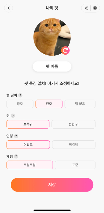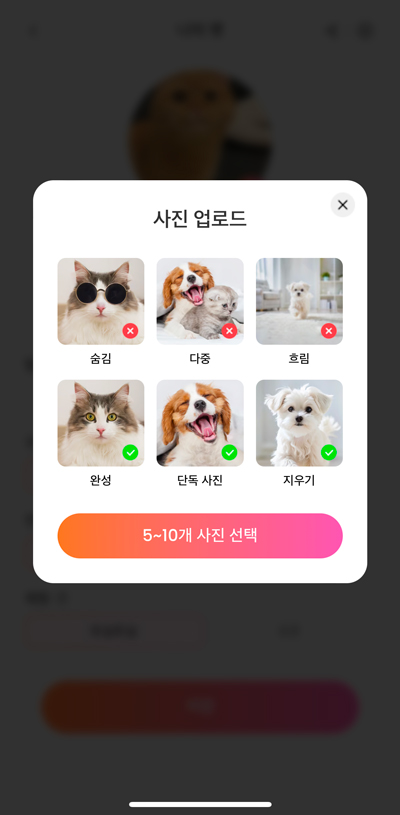 2. 5~10가지의 선명한 펫 사진을 선택합니다. 한 종류의 펫 사진으로 선택해야 함을 유의하세요! 선명하게 나온 사진일수록 자동으로 여러분의 반려동물의 특징(털 길이, 귀 모양, 나이 구분)을 앱 내에서 구별해 줍니다. 결과가 정확하지 않을 경우, 직접 특징을 선택할 수 있으며 한번 선택한 특징들은 자동 저장이 되기 때문에 매우 편리합니다!
