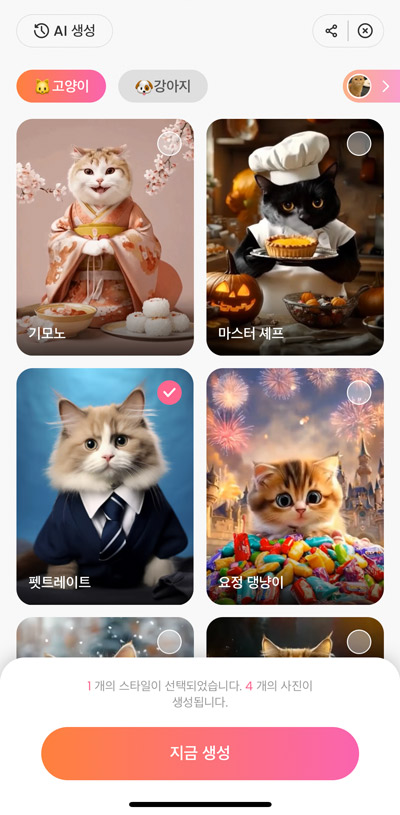 우리 집의 귀여운 강아지나 고양이 사진을 5~10장 선택하는 것만으로 간단하게 AI가 재밌고 놀라운 펫 이미지를 만들어주는 멋진 AI 반려동물 전용 이미지 생성 기능입니다.