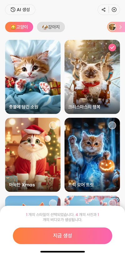 3. 다음으론 원하는 AI 스타일을 골라주세요. 각 스타일마다 4장의 AI 이미지를 제공하며 애니메이션 버전을 선택할 경우 1가지 애니메이션과 4가지 이미지를 함께 제공합니다. 여러분의 취향에 맞는 스타일을 마음껏 선택해보세요!