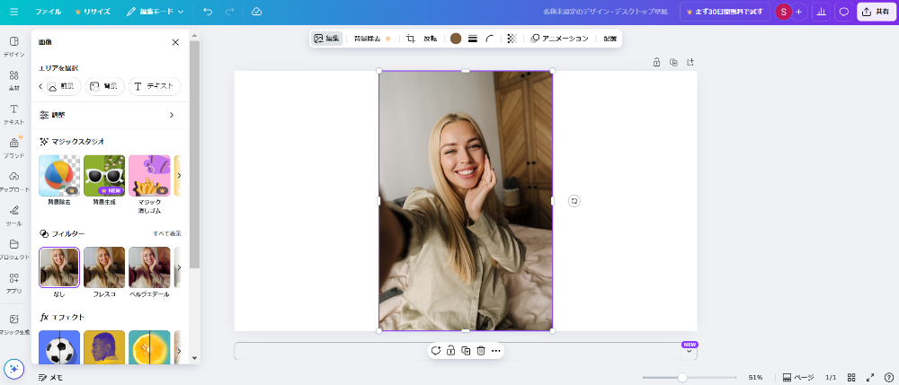 一部機能や素材は有料ですが、写真を反転する機能は無料で使用可能。ほかにも、無料のままでも使用できる機能はたくさんあります。