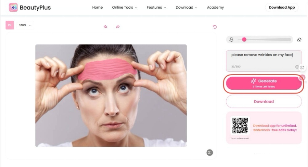 You can use online tools like Fotor or BeautyPlus to remove wrinkles for free with smart AI features.